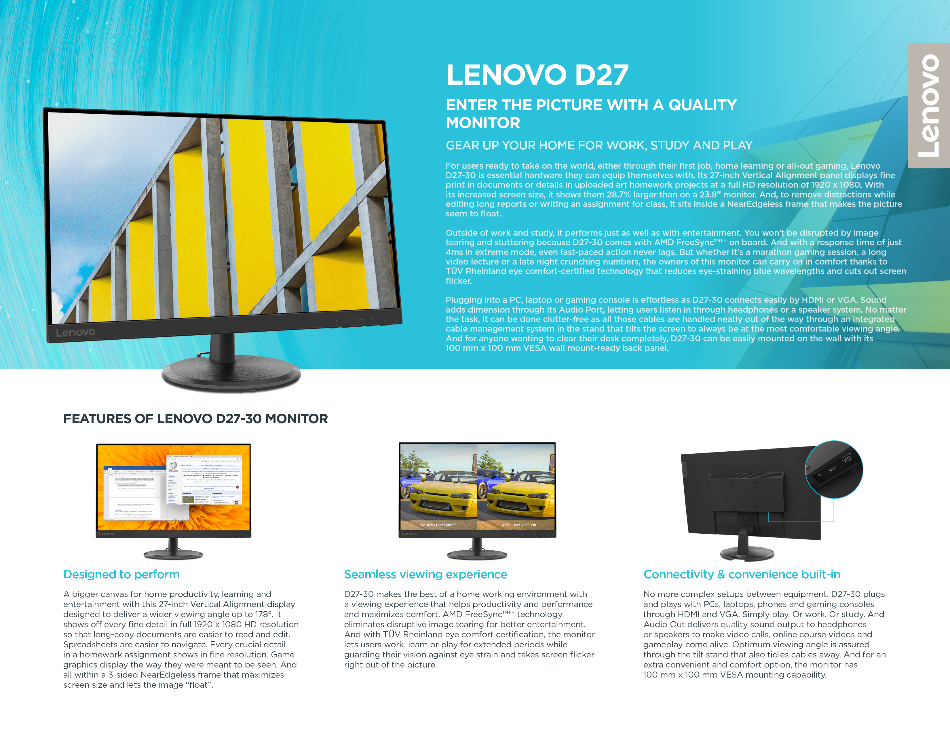 [最佳卖家]联想D27-30 27英寸FHD 1920x1080显示器(66B8KAC6MY)250尼特|72%NTSC 82 dpi |4ms响应率|HDMI VGA多输入|HDMI电缆含|3Y保修